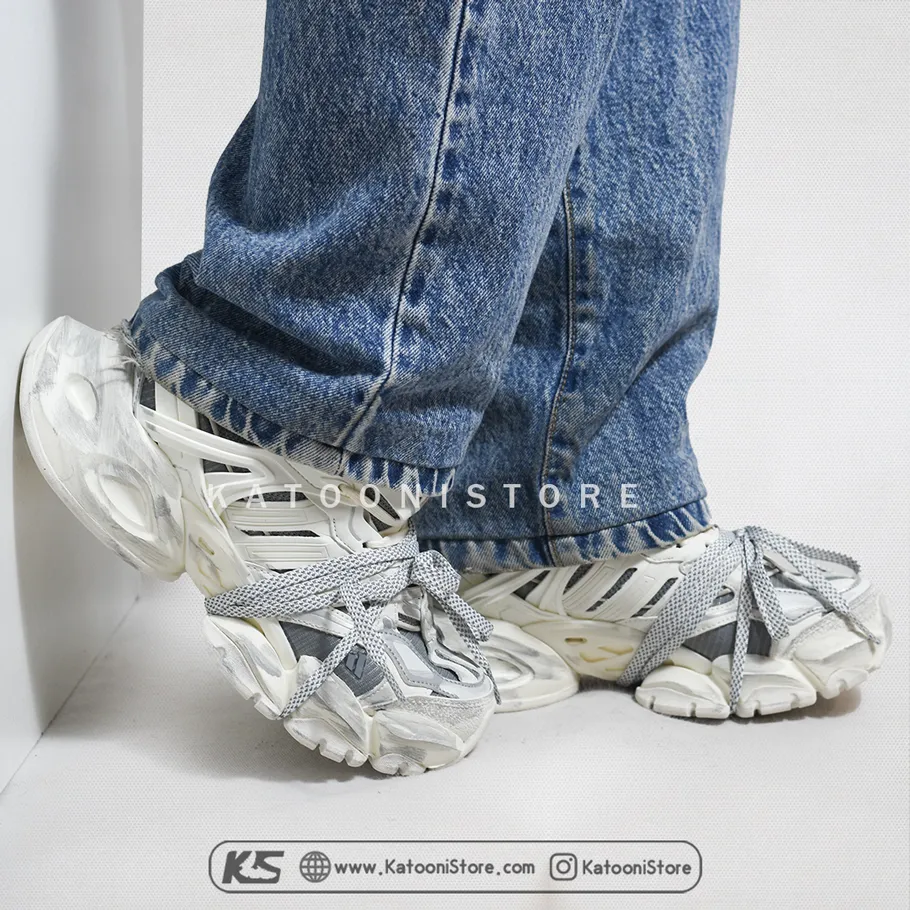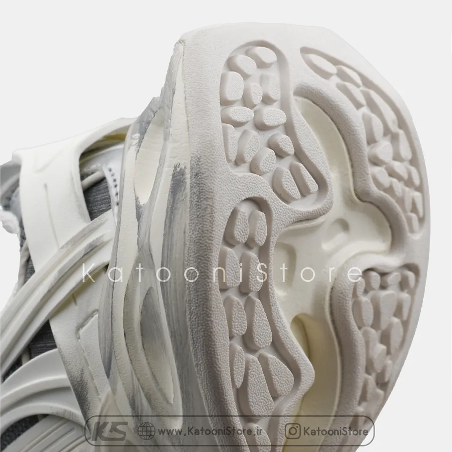 لایهی پایه از مش (Mesh) طوسی روشن یا نقرهای ساخته شده که جریان هوا را بهخوبی عبور میدهد و پا را در طول روز خنک نگه میدارد. این مش زیر پنلهای سفید ضخیمتر نمایان میشود و جلوهای پویا ایجاد میکند. - پوشش چرم سنتتیک سفید: