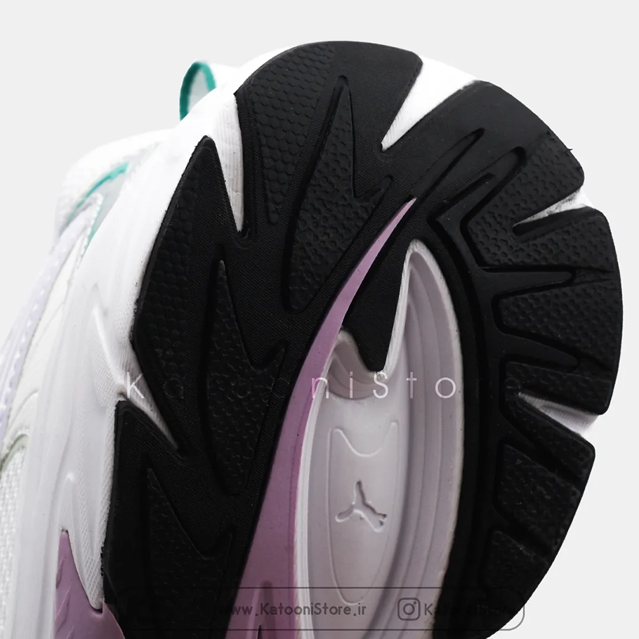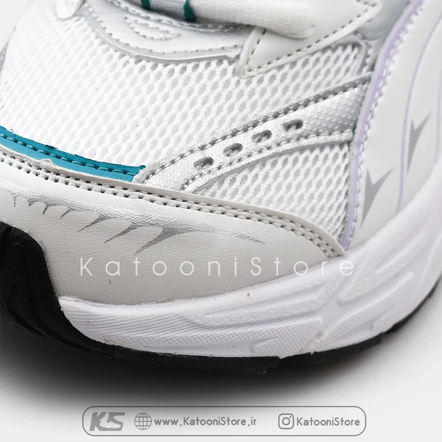 - پالت رنگی جذاب: رنگ پایهی سفید و نقرهای ملایم، زمینهای خنثی فراهم کرده تا رنگ بنفش (Vivid Violet) در بخشهای کلیدی (مانند لبهها، جزئیات زیره و قسمتهای خاص رویه) به زیبایی هرچه تمامتر به چشم بیاید. این بنفش جذاب، انرژی و شور خاصی به کفش میبخشد و آن را برای ست کردن با انواع استایلهای کژوال یا اسپرت آماده میکند.