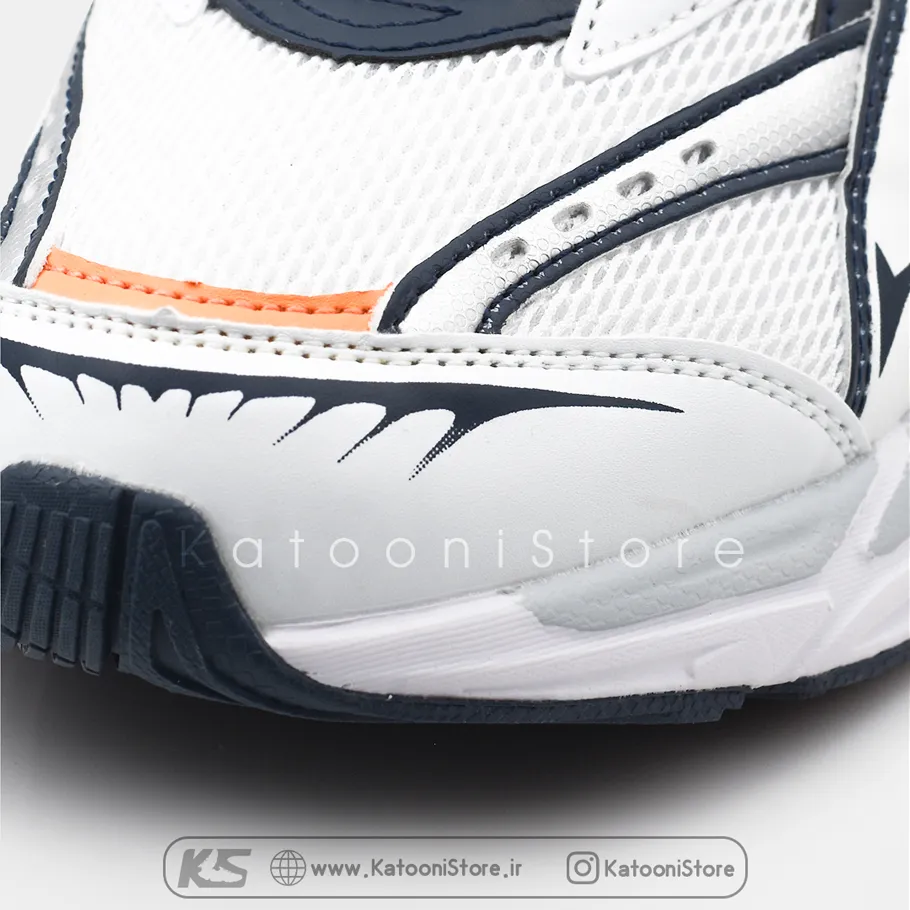 رویه کفش ترکیبی از مش دوبل سفید یخچالی و خطوط چرم مصنوعی سورمهای و نقرهای است. مش دوبل باعث تهویه و خنک ماندن پا در طول روز میشود و از ایجاد رطوبت جلوگیری میکند. خطوط چرم مصنوعی، استحکام و دوام بیشتری به کفش میبخشند و نقاطی که بیشترین فشار را تحمل میکنند، محافظت میشوند.